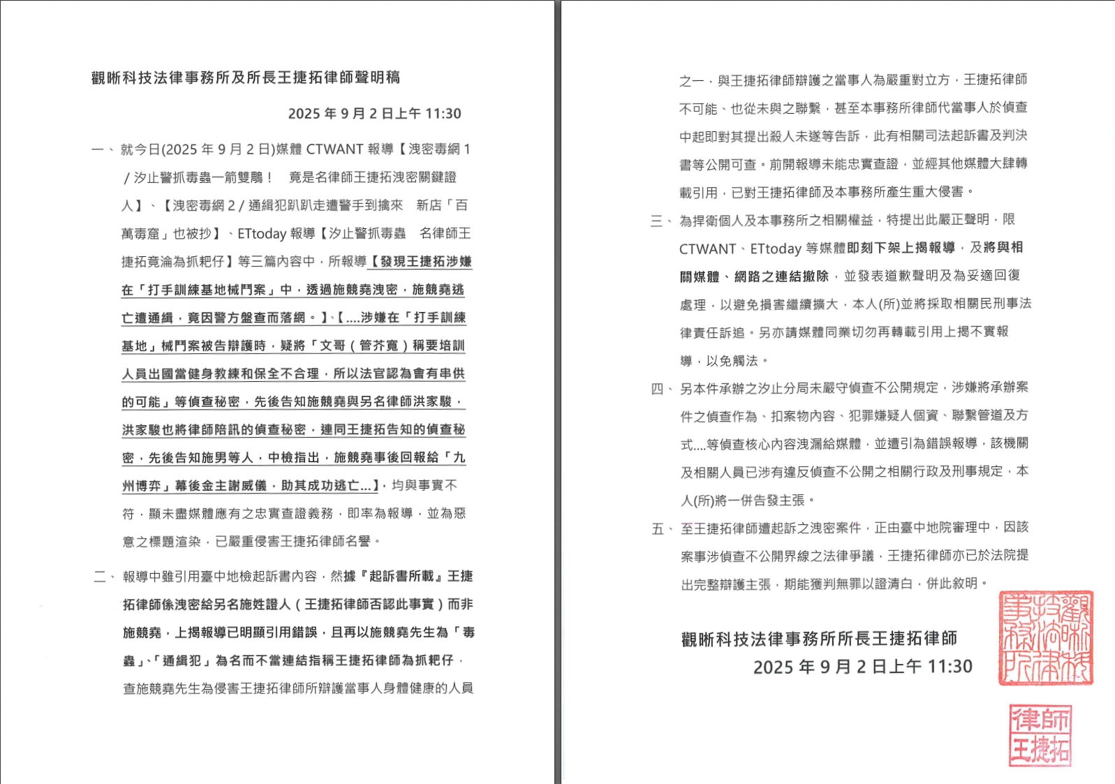 再發聲明給CTWANT: 一、今日經本所與王捷拓律師發布聲明後,貴公司之更正報導僅是將王捷拓律師照片更換,文字內容作部分修改,但仍留存「施競堯是王捷拓洩密案的關鍵證人」之字樣,然本所需再嚴正聲明: ...閱讀更多